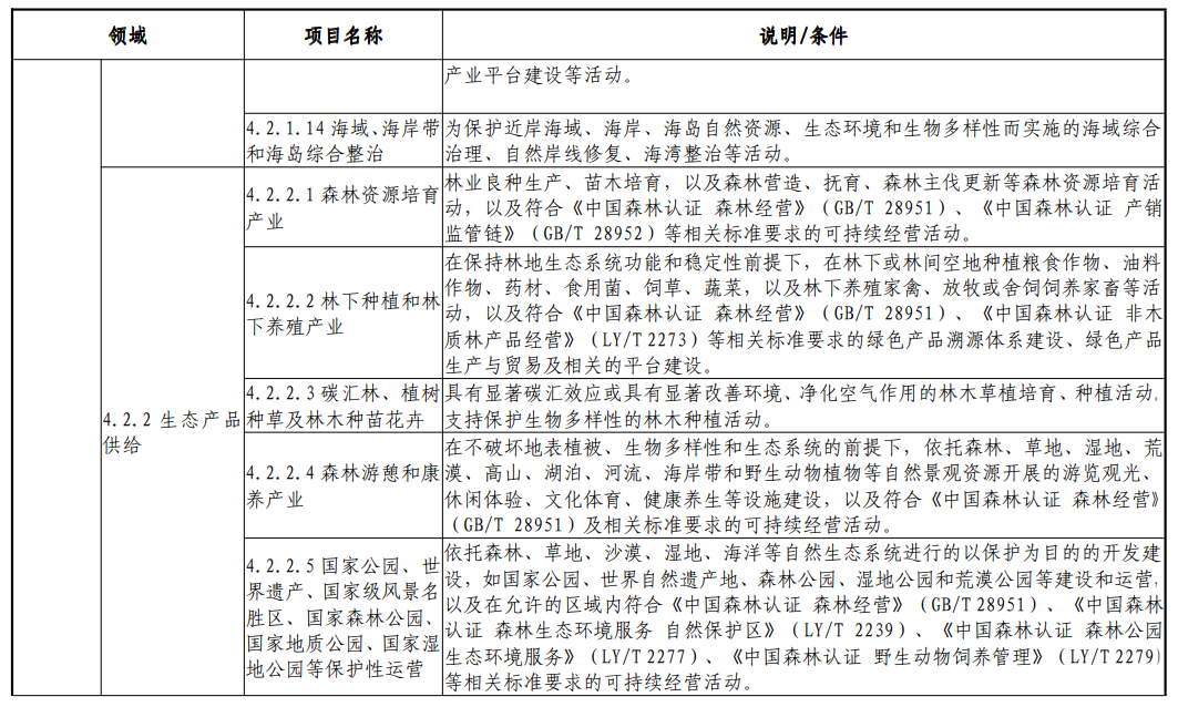 在生态产品供给领域(4.2.2)中,“森林资源培育产业”“林下种植和林下养殖产业”“森林游憩和康养产业”“国家公园、世界遗产、国家级风景名胜区、国家森林公园、国家地质公园、国家湿地公园等保护性运营”等4类项目可申请绿色债券,具体说明条件如下: 绿色债券是指将募集资金专门用于支持符合规定条件的绿色产业、绿色项目或绿色经济活动,依照法定程序发行并按约定还本付息的有价证券,包括但不限于绿色金融债券、绿色企业债券、绿色公司债券、绿色债务融资工具和绿色资产支持证券。《绿色债券支持项目目录(2021年版)》是专门用于界定和遴选符合各类绿色债券支持和适用范围的绿色项目和绿色领域的专业性目录清单,是各类型绿色债券的发行主体募集资金、投资主体进行绿色债券资产配置、管理部门加强绿色债券管理、出台绿色债券激励措施等提供统一界定标准和重要依据,也是发挥好绿色债券支持环境改善、应对气候变化、提升资源节约利用效率、推动经济社会可持续发展和产业绿色转型升级等工作的重要技术支撑。